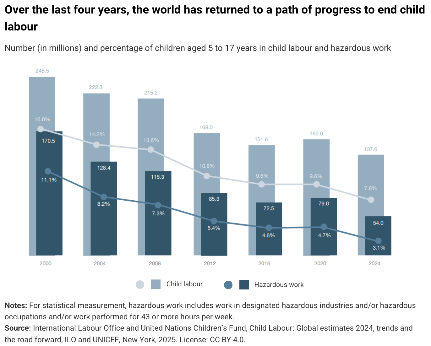 After a concerning rise in child labour captured by the global estimates for 2020, a feared further deterioration in the wake of the COVID-19 pandemic has not materialized, and the world has succeeded in returning to a path of progress. There are over 100 million fewer children in child labour today than in 2000, even as the child population increased by 230 million over the same period.