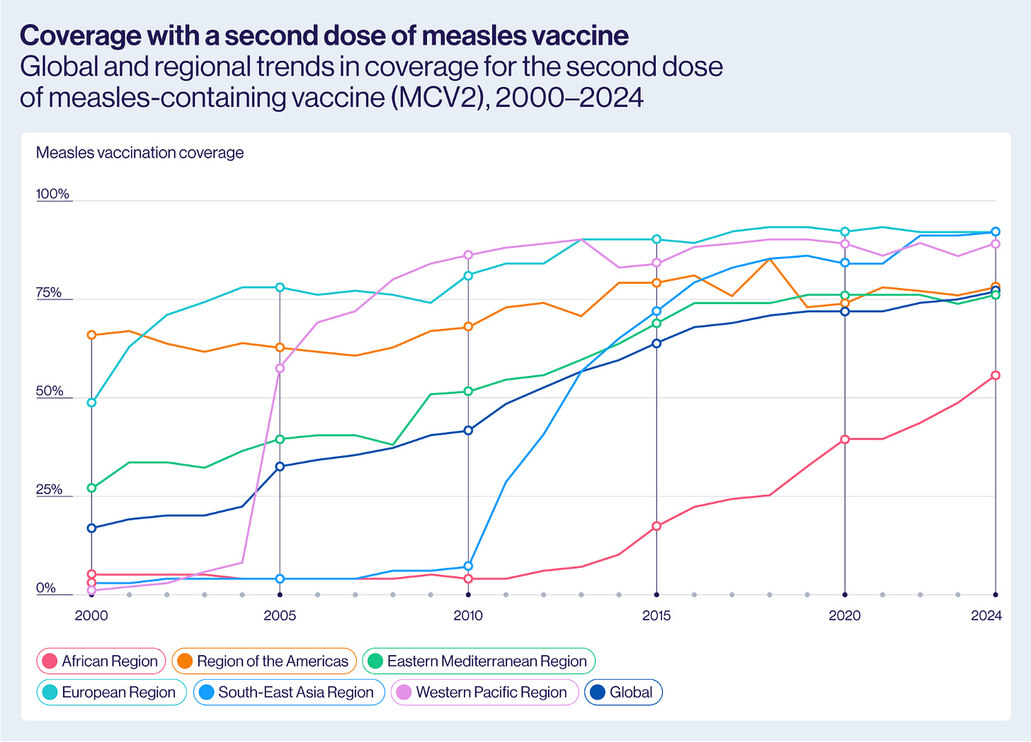 Humanity’s fight against measles in three charts. A new report from the WHO reveals that annual measles deaths fell by 88% between 2000 and 2024, from 777,000 to 95,000 a year. Vaccinations have prevented an estimated 58 million deaths over this period, one of our species’ greatest ever achievements. Routine immunisation, including a second-dose surge from 17% to 76%, has reshaped our collective immunity, particularly in Africa, yet there is still so much work to be done: 20.6 million children missed their first dose last year, driving outbreaks in 59 countries. Gavi
