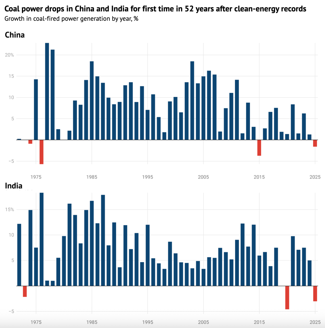 Coal power falls in both India and China. In 2025, coal-fired electricity generation fell simultaneously in India and China for the first time since 1973. India cut coal power 3% and China 1.6% as record solar, wind and storage additions outpaced rising demand. Together, these two countries account for roughly 40% of global annual COâ emissions from fossil fuels and industry. Guardian