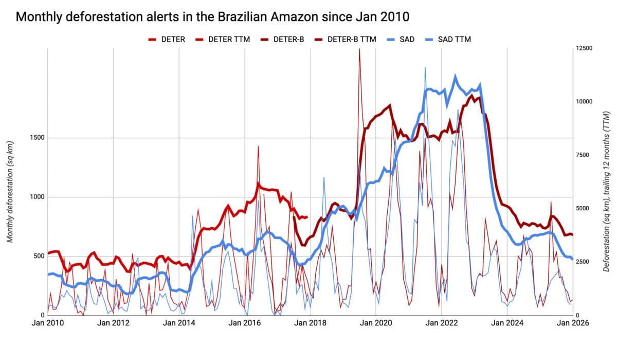 Deforestation in the Brazilian Amazon on track to fall to its lowest level ever recorded. Brazil detected 1,325 km² of deforestation between August 2025 and January 2026, down from 2,050 km² a year earlier. Annual loss fell 11% to 5,796 km², an 11-year low. Environment Minister Marina Silva says that if current policies hold, the country could reach a historic milestone. “There is an expectation that we will reach, in 2026, the lowest deforestation rate in the historical series in the Amazon if we continue with these efforts.”