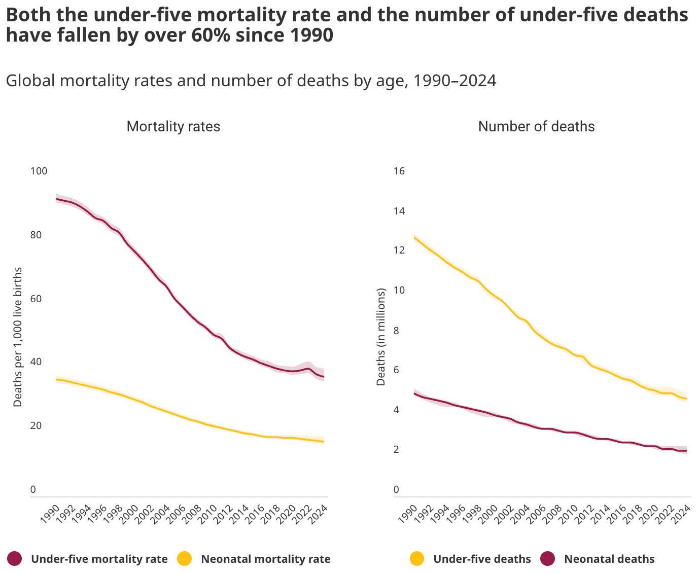 Child mortality down 60% in two generations, as low-cost tools save millions. Since 1990, global under-five deaths have fallen from 13 million to 4.9 million a year, one of the largest public health gains in human history. Vaccines, oral rehydration, bed nets and safer births have been at the heart of this, with deaths from diarrhoea down 75% and malaria by 63%. Although progress has slowed in the last decade, the tools to prevent most remaining deaths exist. The gap is now political will rather than innovation. UNICEF