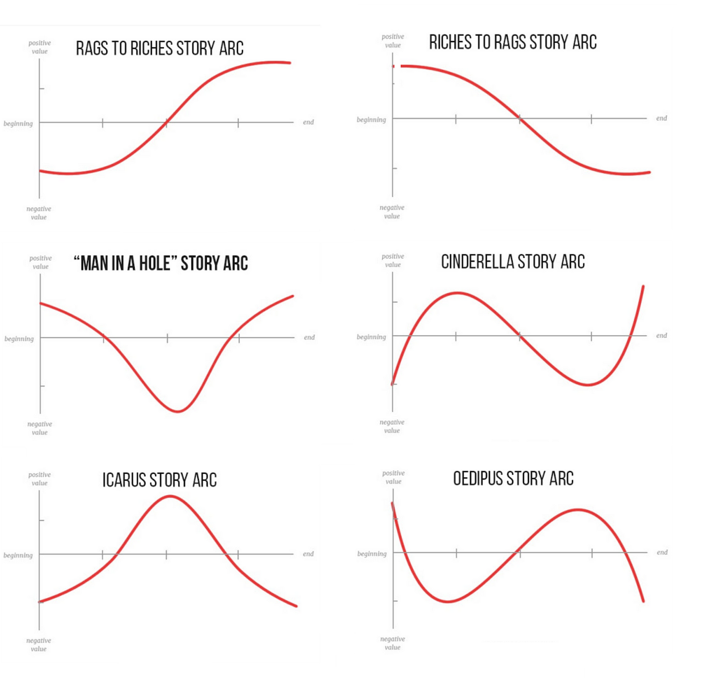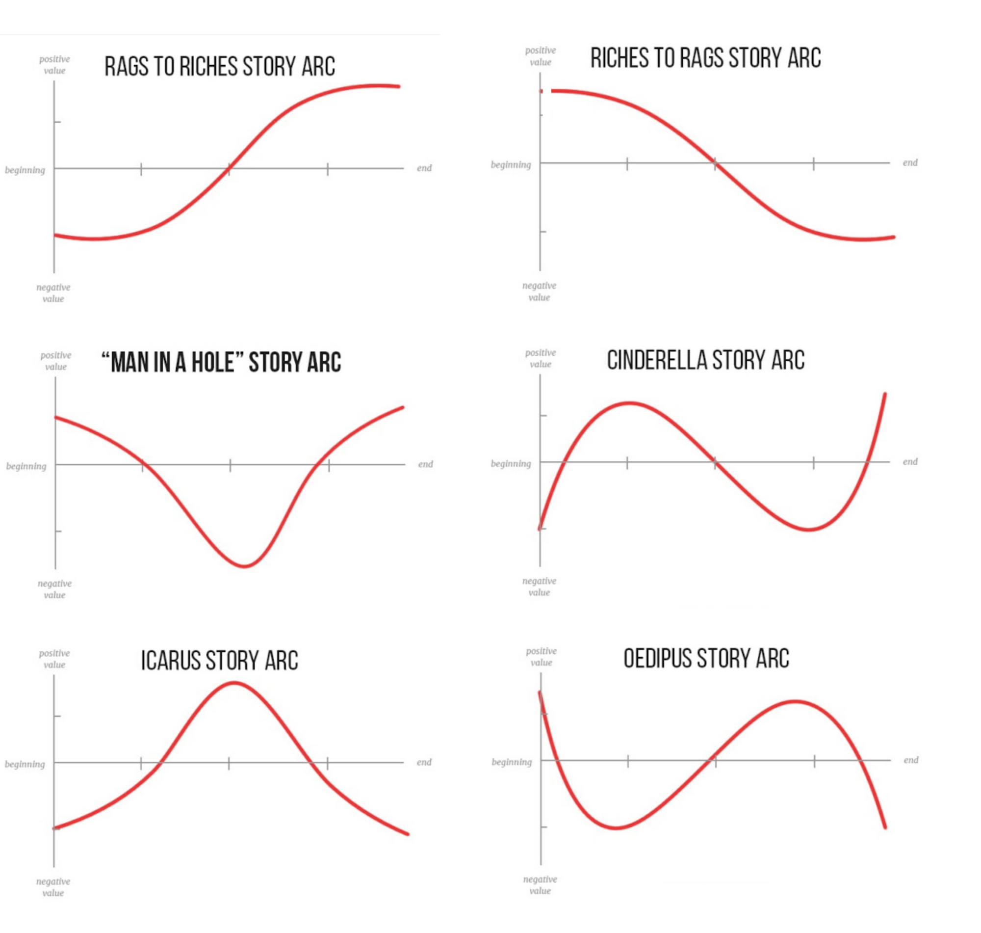 There are other story arcs too. In Rags to Riches, a continuous upward climb towards happily ever after (and in Riches to Rags, the opposite). In Man in a Hole, the main character gets into trouble, then gets out of it again (Alice in Wonderland, Finding Nemo), or even better, double Man in a Hole, for double the emotional impact (hello Harry Potter and The Lion King). In Icarus, there’s a rise, followed by a fall (Jurassic Park, The Great Gatsby, actually pretty much anything with the word ‘great’ in its title), while Oedipus is the tragic mirror image of Cinderella giving us Frankenstein, Moby Dick, and The Godfather.