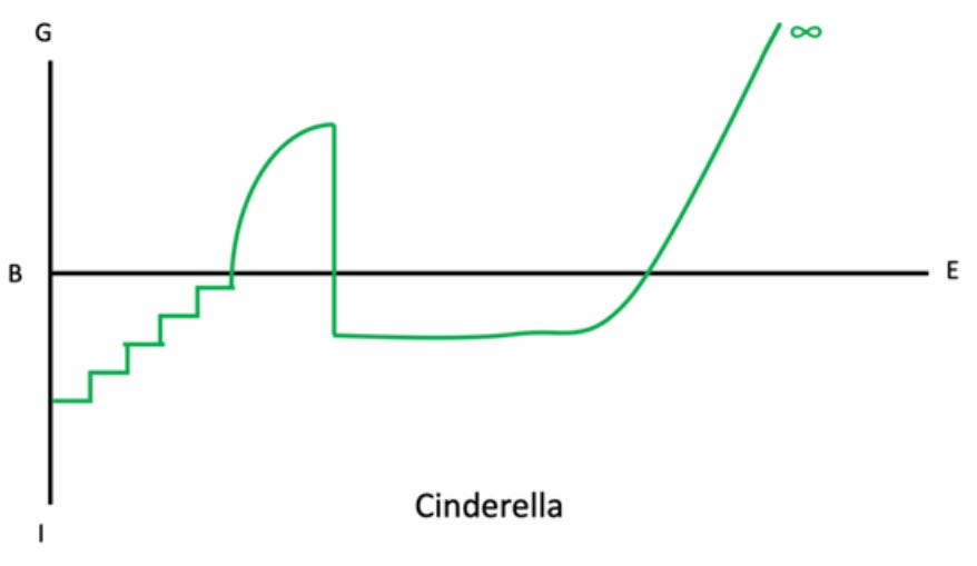 To illustrate his point, Vonnegut plotted the story of Cinderella on a graph, charting misery versus ecstasy over time. The arrival of the fairy godmother kicks off a step by step climb in fortune, leading to a high point at the ball, followed by a sudden reversal at the stroke of midnight. The good times come roaring back though, thanks to that glass slipper, leaving our protagonist even better off than she was before. This arc, said Vonnegut, is evident in some of our favourite stories, from the New Testament to Jane Eyre and Frozen. It’s immensely satisfying, hence its enduring appeal.