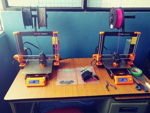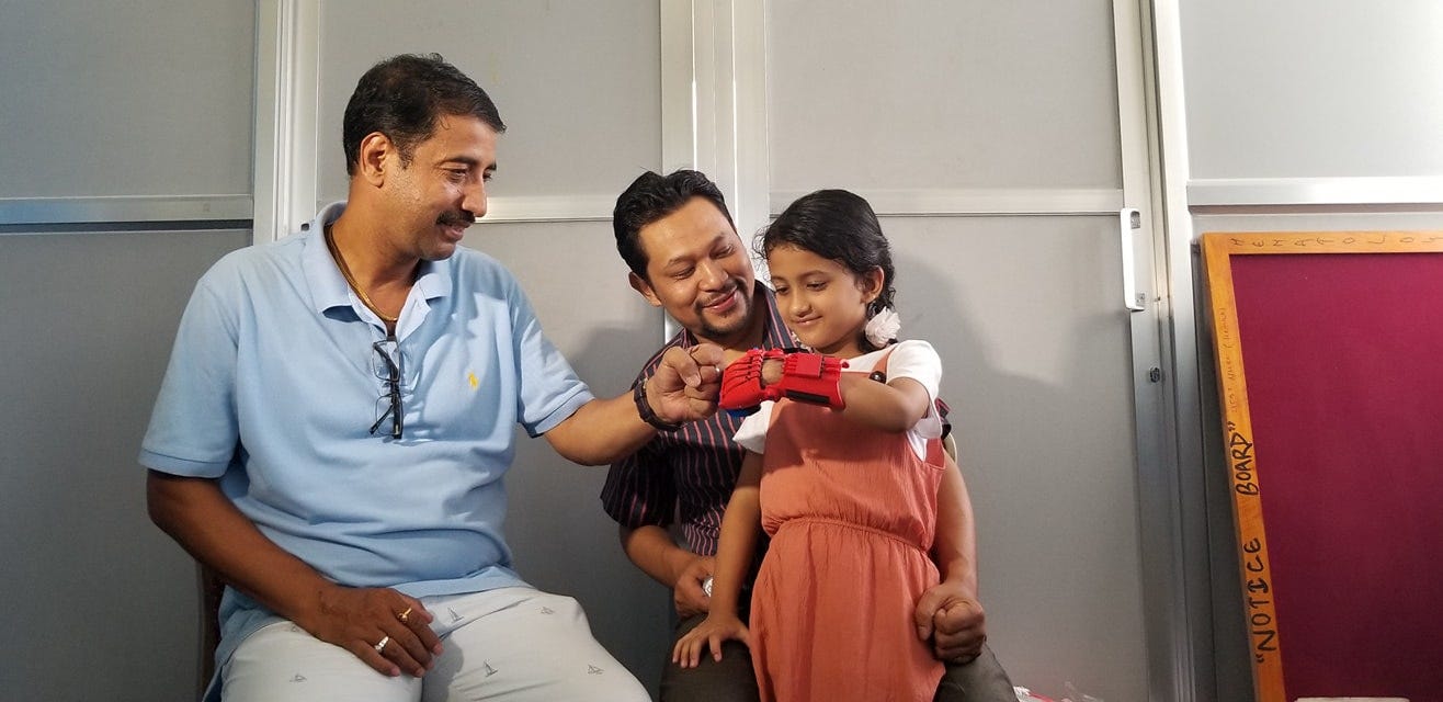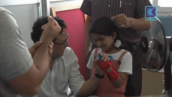 We sent them $2,400 to buy two Prusa i3 MK3 printers. Then the team flew to Kathmandu, where they set up a prosthetics fabrication workshop in a local hospital. They even put our logo on the printers! A few months later, they wrote to us to tell us about their first recipient, Khusi Shrestha. She's 7 years old, and loves the colour red. She lost her hand shortly after birth due to complications with medications. Here she is sporting a brand new red and blue Raptor Reloaded 3D printed hand, open-sourced and hot off the Future Crunch printers.