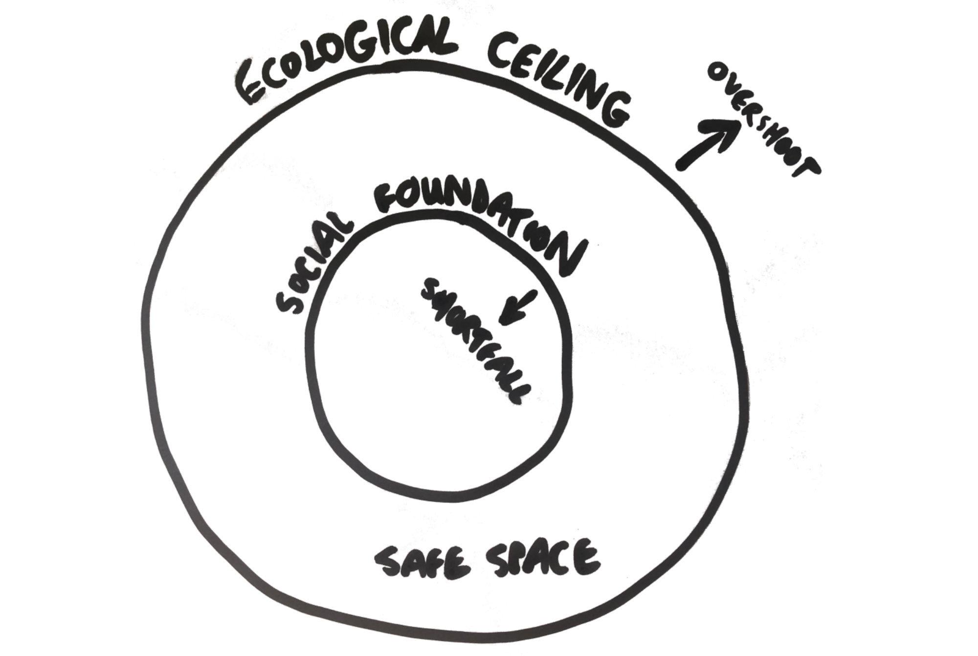 Raworth has been drawing this doughnut in meeting rooms and at conferences around the world for years. She recounts the story of how in 2011, in the run up to a conference on sustainable development, she showed it to European officials and the British representative piped up. “We hear the Latin Americans talk of ‘Pachamama’ and find it all a bit fluffy” he said — waggling his hands in the air to illustrate — “but I can see that this is a science-based way of saying something that’s actually not so different.”
