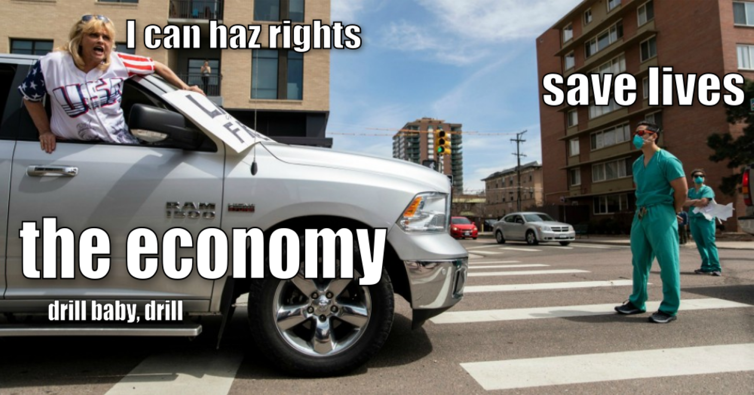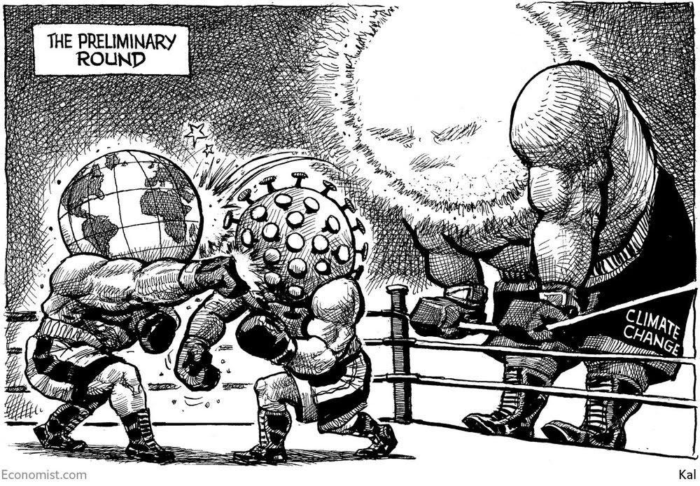 This picture is a pretty good snapshot of where most of the world’s liberal democracies stand right now. All three elements of the straitjacket are perfectly in play. On the frontlines, the healthcare workers, expected to survive on claps rather than protective equipment. Bearing down on them, an economy powered by fossil fuels and driven by people who still believe there’s no such thing as society. At the moment it’s stuck in neutral, but there’s a 3.6 litre V6 under the hood of that thing and eventually the urge to stomp on the accelerator is going to become overwhelming.
